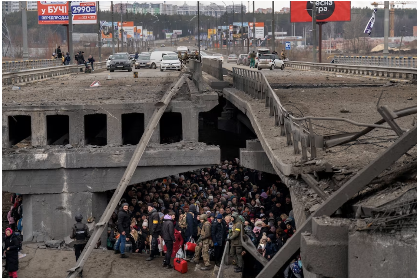 Ukrainians crowd under a destroyed bridge as they try to flee across the Irpin River (4 km away from Bucha) in the outskirts of Kyiv in early March.(AP: Emilio Morenatti)